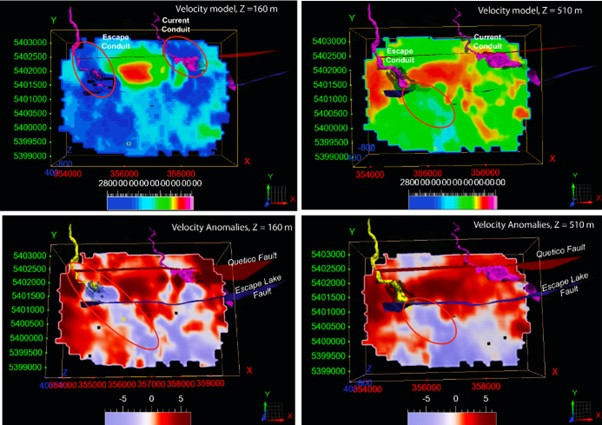 The velocity model reveals a significant negative velocity anomaly around the Escape and Current conduits at a depth of 160 metres. This anomaly extends persistently along the strike of the Escape conduit, reaching depths of up to 700 metres in the southern part of the Escape Fault. This suggests the potential for extending the Escape conduit along the southeast axis at varying depths. The observed velocity decrease in the southern section of the Escape Lake Fault partially aligns with the magnetic inversion model. Notably, where negative velocity anomalies coincide with positive magnetic anomalies, the possible location of the conduit is highlighted.