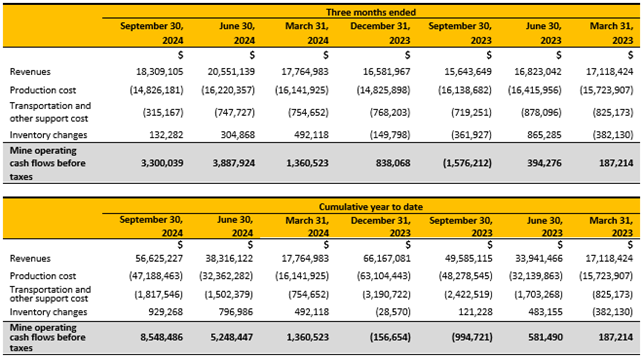 Mine operating cash flow before taxes is a non-IFRS measure that does not have a standardized meaning prescribed by IFRS and therefore may not be comparable to similar measures presented by other issuers. Mine operating cash flow is calculated as revenue minus production costs, transportation and selling costs and inventory changes. Mine operating cash flow is used by management to assess the performance of the mine operations, excluding corporate and exploration activities, and is provided to investors as a measure of the Company's operating performance.