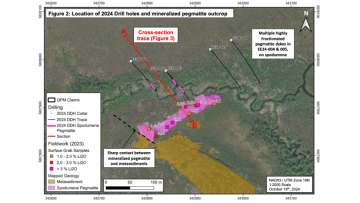 The five holes intersected highly fractionated pegmatite dyke(s). The pegmatite dyke intersected in the first three holes were mineralized in spodumene. The spodumene is concentrated almost continuously throughout the width of the dyke. The pegmatite dykes were systematically sampled and sent for assay and metallurgical testing (assay pending).