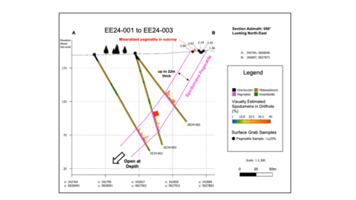 EE24-002 | 342839.3 | 5827977 | 125.85 | 140 | -55 | 28 | 72.80 | 95.28 | 22.48 | Pegmatite |