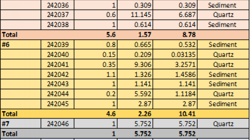 The remaining channel sample results, 21 samples from channels 8 to 15, from the Western Trend trench (see channel sample location map) confirm that an east-west trending, high-grade vein system (the East-West Splay) occurs in the Western Trend. It is highlighted by channel #8, which returned 8.10 m of 7.09 g/t Au, including 3.20 m of 14.29 g/t Au. A total of 41.2 m, representing 57 separate samples, ranging from 0.15 to 1.10 m (with a median length of 0.73 m), returned an average weighted grade of 5.79 g/t Au with all samples analyzed by total pulp metallic assaying at Eastern Analytical Ltd. in Springdale, NL.