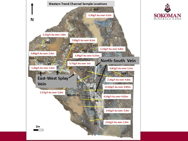 Sokoman Minerals Corp. (TSXV:SIC)(OTCQB:SICNF) ("Sokoman" or the "Company") is pleased to announce that a minimum 1,500 m diamond drill program has begun to test the Western Trend gold zone based on information gained in the trenching program. Drilling will consist of 20 to 30 diamond drill holes testing along strike / down dip of the newly discovered, east-west trending, gold-bearing vein network exposed in the Western Trend trench, a splay off of the main, north-trending vein system similar to the Footwall Splay trend off of the main Eastern Trend. The trenching was initiated as a first step towards a conventional (drill and blast) bulk sample from the Western Trend.