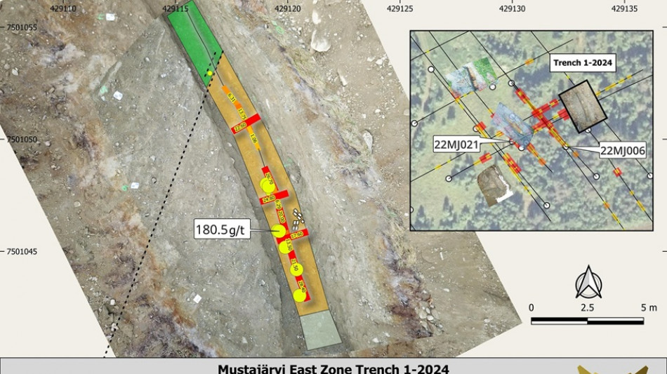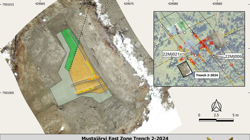 The mineralization exposed in the trench was broadly similar to the style and intensity of alteration evident in Trench 1-2023. However, geologists have estimated that the original sulphide content may have been lower in the 2024 trench, based in part on the less abundant and intense red and orange colours of the gossan. All these samples were thoroughly oxidized, and this supergene process may locally enrich gold grades relative to fresh rock. More work will be required to ascertain the degree (if any) of supergene enrichment. The same observation has been noted about high-grade gold in oxidized drill core from Mustajärvi.