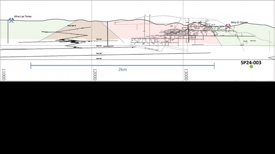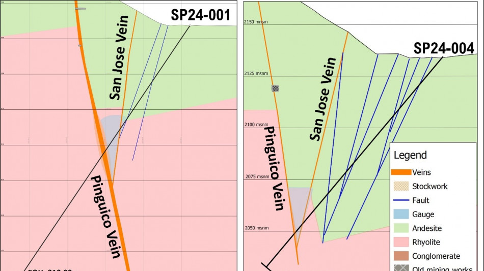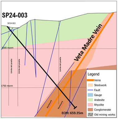 In 2024, a single deep drill hole - SP24-003 - was drilled to a 659m core length to advance the Company's understanding of the relationship between Veta Madre and the El Pinguico vein structure at depth. This drill hole successfully intersected a broad (approximately 60m in core length), highly altered, deformation zone associated with the Veta Madre fault zone - the first time Veta Madre proper has been intersected on the Pinguico property. Within this zone, which is located within the highly productive Guanajuato Conglomerate Unit, the drill hole encountered an interval of stockwork with 0.56 gpt gold over an estimated true width of 1.13m.