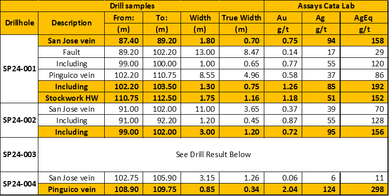 In 2024, drilling was conducted on the southern portion of the property with the objective of exploring the El Pinguico and San Jose veins along strike to the south. A total of 446 metres were drilled in three drill holes with the following results. Unless otherwise noted, all references in this news release to silver equivalent or AgEq have been calculated using 85:1 gold/silver (Ag/Au):