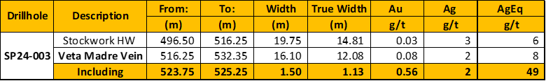 The Company drilled a single deep hole of over 650 meters that has successfully intersected the Veta Madre vein on the El Pinguico property. Drill hole #SP24-003 confirmed the potential for an important confluence of the Pinguico mineralized system with the prolific Veta Madre regional fault structure.