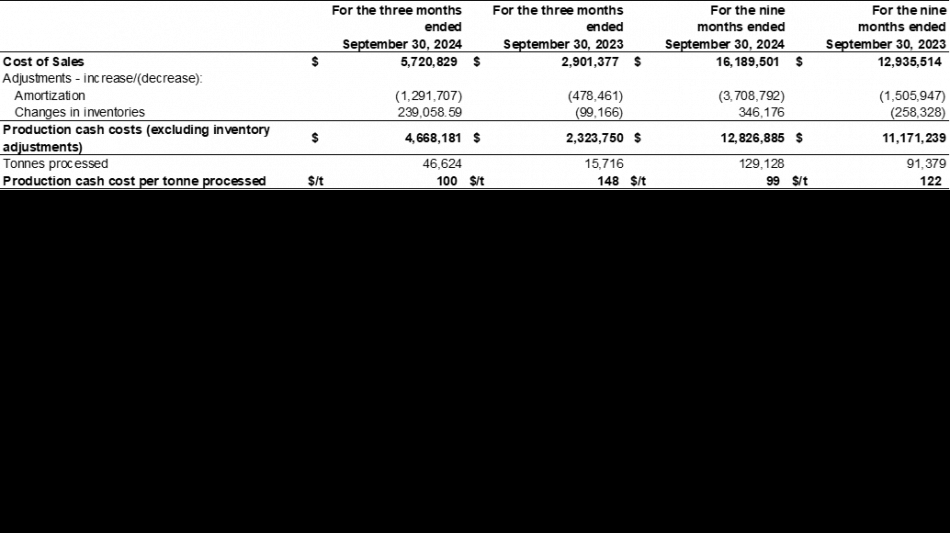 A reconciliation between production cost per tonne (excluding amortization and changes in inventories) and the cost of sales is provided below. Changes in inventories are excluded from the calculation of Production Cost per Tonne Processed. Changes in inventories reflect the net cost of concentrate inventory (i) sold during the current period but produced in a previous period or (ii) produced but not sold in the current period. The Company uses Production Cost Per Tonne Processed to evaluate its operating performance in addition to IFRS measure because Company believes that conventional measures of performance prepared in accordance with IFRS do not fully illustrate the ability of its operations to generate cash flows. Management and certain investors also use this information to evaluate the Company's performance relative to peers who present this measure on a similar basis.