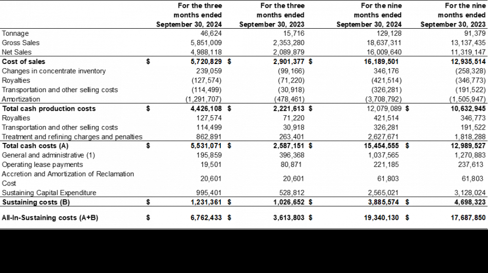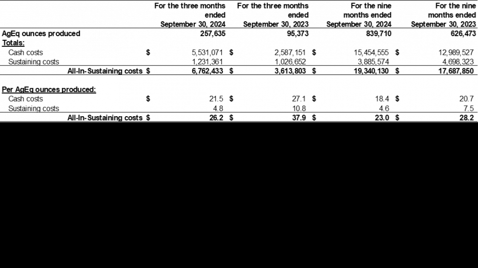 To improve the accuracy and presentation of AISC calculations, Silver X refined the composition of General & Administrative Expense in sustaining cost, excluding discretionary costs for business development, investor relations and share-based compensation. For comparative purposes the prior period were also recalculated based on the revised methodology, resulting in AISC of $26.2 for the three months period ending September 30, 2024, compared to $37.9 for the same period in 2023 (30.7% decrease) and $23.0 for the nine months period ending September 30, 2024, compared to $28.2 for the same period in 2023 (18.4% decrease).