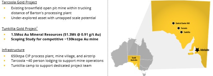 Barton Gold is an ASX, OTCQB and Frankfurt Stock Exchange listed Australian gold developer targeting future gold production of 150,000oz annually, with ~1.6Moz Au JORC Mineral Resources (52.3Mt @ 0.94 g/t Au), multiple advanced exploration projects and brownfield mines, and 100% ownership of the only regional gold mill in the renowned central Gawler Craton of South Australia. *
