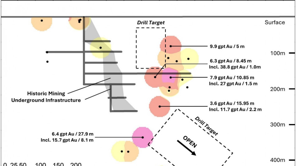Figure 2 shows a long section through the old mine workings and outlines some target drilling areas. Historical drilling intercepts include a 27.9 metre intersection of 6.4 grams per tonne ("gpt") of gold containing 8.1 metres of 15.7 gpt gold.