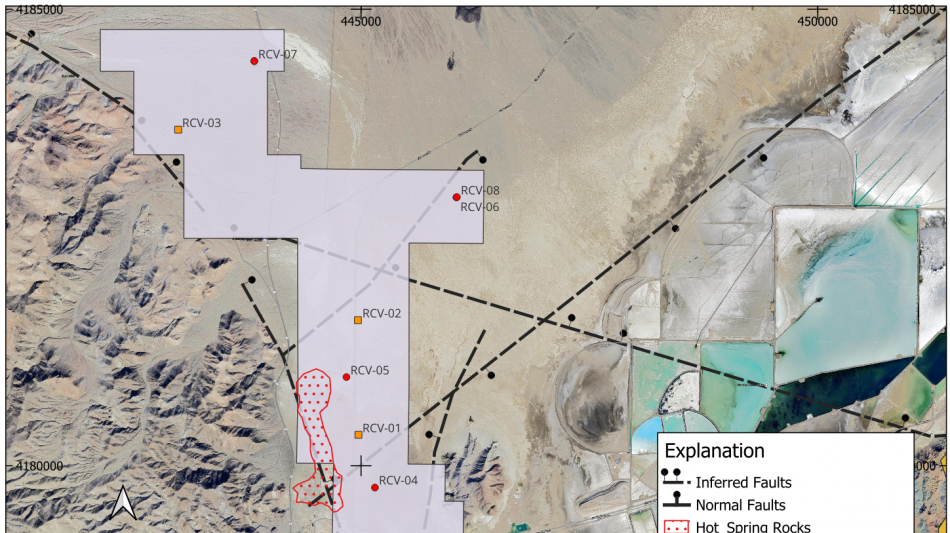 Tuffaceous sediments (including sinter and travertine), and alluvial gravels with anomalous lithium were encountered in nearly every hole. Water temperatures were elevated in all holes with a peak temperature of 85˚C in RCV-05. The presence of sinter and travertine in the holes suggests that hot-springs sediments covered a much broader area than the mapped exposures indicate.
