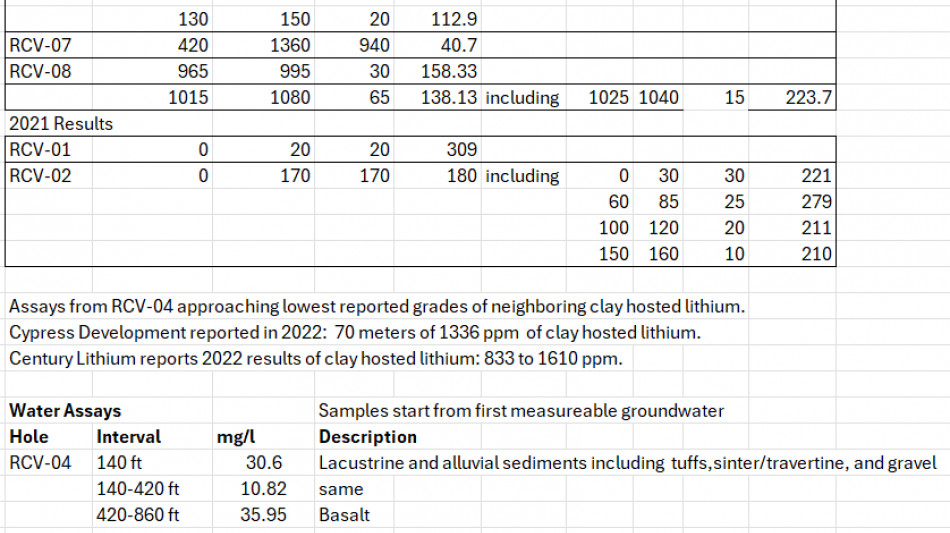 Lithium concentrations in water samples were determined in all holes. The best drill-cutting intercept occurs in RCV-04 in tuffaceous sediments between 80 and 250 feet with an average of 298 ppm Li that includes grades to 741 ppm and is worthy of further exploration. Published low-grade clay-hosted lithium assays are approximately 800-850 ppm. While lithium assays generally diminish to the north, there is still untested property to the south to explore for shallow, but higher-grade lithium which is of considerable interest to the Grid Exploration Team.