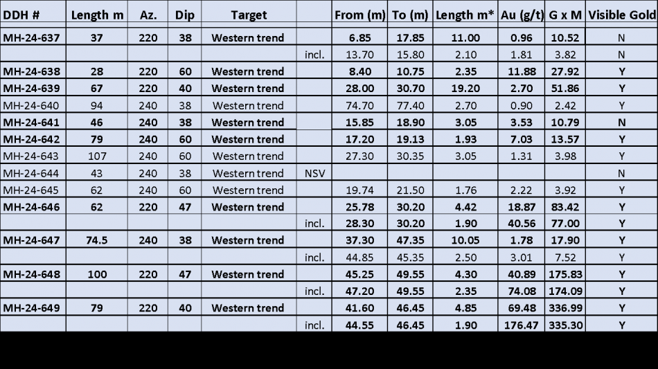 MH-24-646 26.72 g/t Au over 3.10m incl. 40.56 g/t Au over 1.90 m from 28.30 m