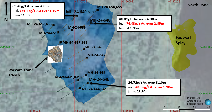 The recent Western Trend drilling has tested 100 m of strike to 80 m down dip, with the zone remaining open. The remaining assays are expected in 3-4 weeks. The next phase of drilling will be mainly deeper holes targeting the high-grade plunge of the intersection point between the east-west trending splay and the main north-trending vein system (down plunge from MH-24-648 and 649) to a depth of 165 m down plunge and 100 m vertically. This area is a key target as it is a location where rock preparation is ideal for gold deposition with the potential to be where there is dilation zone. We will also be testing to the south of the trench (south of MH-24-646) to extend the strike to 145 m.