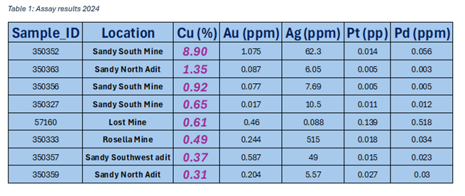 "These analytical results, coming from samples taken in outcropping rocks, confirm clearly the mineral potential of the Copper Chief property and motivates the company to continue its exploration surveys. The multielement/multitarget characteristics of the asset was confirmed, with a special relevance to copper and to the Sandy Mines area.