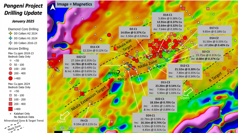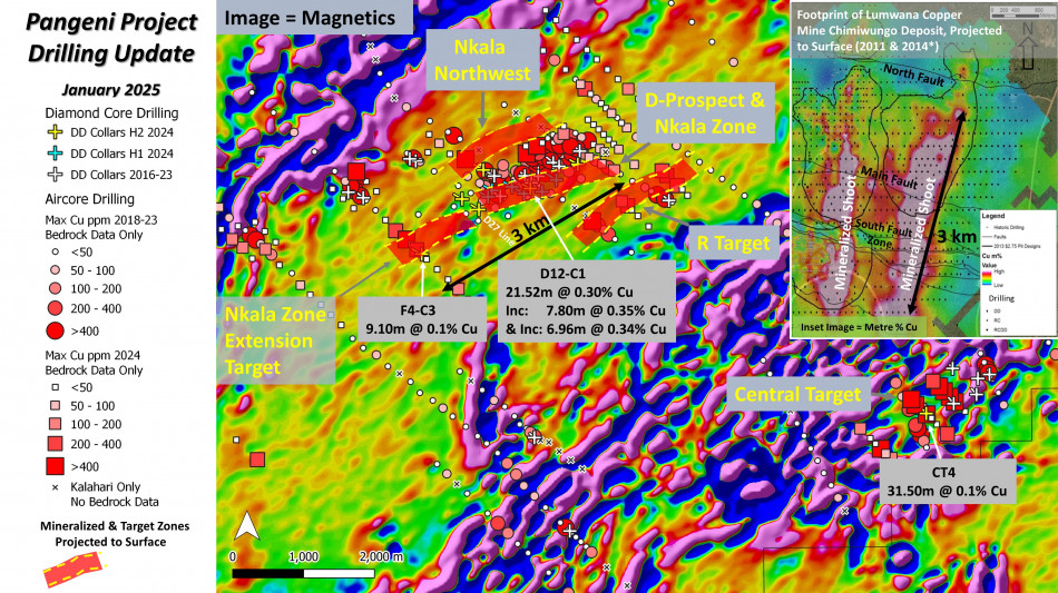 John Wilton, President and CEO of BeMetals, stated "We are pleased to report the latest core drilling program has returned results indicating that the discovered D-Prospect copper mineralization and its target zones, at the Pangeni Copper Project have been significantly expanded. Following the recent drilling, the overall scale of the D-Prospect copper mineralization and its target footprint are now comparable to that of the Lumwana Copper Mine's Chimiwungo Deposit. The mineralization is now interpreted to extend for some 3 kilometres along trend for the Nkala and Nkala Zone Extension with the additional target zones of Nkala Northwest and R Target in close proximity. These recent H2 2024 results combined with the H1 2024 drill intersections of the Nkala Zone, advance and reinforce the potential for the Pangeni project to deliver a large-scale copper discovery.