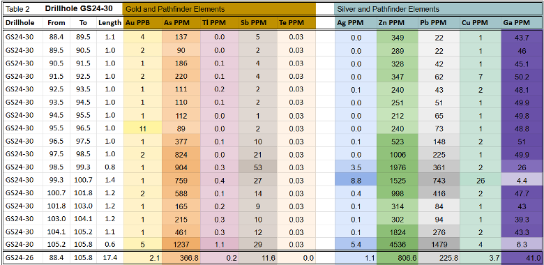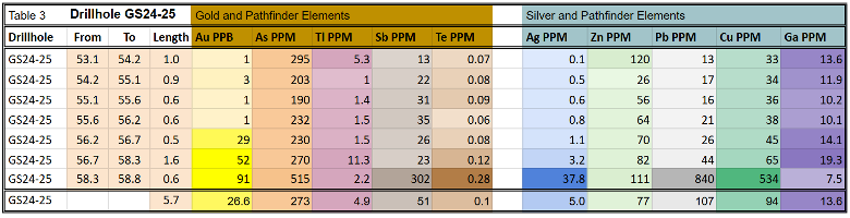GS24-25, GS24-26, and GS24-27 were drilled in South Sadler along mineralized structures where they cut the recently identified IB rock unit, which lies at the base of the Pilot Shale and is associated with Carlin gold mineralization at Pipeline-Cortez-Goldrush and Carlin-Goldstrike. 2011 drilling 500 metres to the east (GS11-02) targeted some of these structures and ended in the carbonates after cutting the IB zone. Assay results for GS11-02 are not publicly available. Holes GS24-25 to 27 were designed to test this zone up-dip and shallower than this older hole, and they returned some of the strongest gold, silver and related pathfinder elements cut in the 2024 program within the IB. Drill hole GS24-25 cut 5.7 meters of IB downhole from 53.1 to 58.8 meters (See Table 3) and GS-26 cut 4 metres of IB downhole from 61.7 to 65.7 metres (See Table 4). Assays in the IB in both holes revealed elevated Au, As, Sb and Te, especially at the base of the unit where alteration indicates mineralization fluid movement. Notably, the IB also appears to have been a favourable control on CRD mineralization as it also hosts some of the most significant Ag, Pb, Zn, and Cu (CRD-related metals) cut in the program (Table 3, 4). The IB lies at the base of the thick Pilot Shale, above a thick section of carbonate rocks favourable for CRD development, and the Pilot may have acted as a seal that confined the CRD fluids to the IB and those carbonates below. Following high CRD metals values in the base of the IB may be a valuable exploration guide to coherent CRD mineralization down-dip at depth in the carbonates. The IB was also intersected near surface in Hole GS24-28 in the 007 Zone (See full results by following the link).