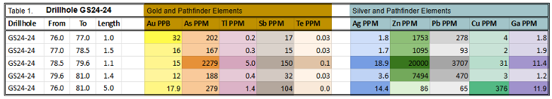 GS24-30 at Union was perhaps the most interesting hole of the drill campaign. In addition to combined Gold and Silver mineralization, this vertical hole cut highly altered felsic dikes of the kind commonly found in the distal parts of CRD systems. The dikes show contorted flow banding and brecciation typical of volatile-rich CRD dikes and are flanked by complexly deformed pervasive black silicification and argillic alteration. The dike shows a consistently pronounced Gallium signature (41 ppm Gallium over 17.4 m. See Table 2), which may have important implications for the nature of the magmatic system(s) driving Gryphon and the potential for elevated Gallium in associated mineralization (See Table 2 and full drill results)