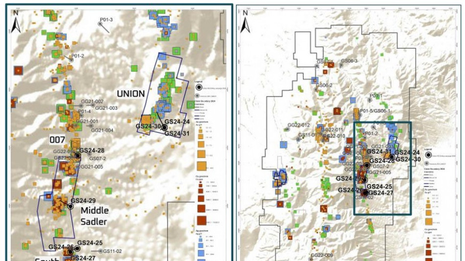Figure 1. Map of the overall 12,058 ha Gryphon Summit Project (right) and zoomed in on the 2024 area of interest (left) with 2024 drill holes noted in black and the 23 historical drill holes in grey. Sampling results from the project are in representative color and scale relative to the element. Gold is yellow with the highest values between 15.1-24.2 ppm, Copper is red with the highest values between 5-11.6%, Silver is blue with the highest values between 300-2060 ppm and Zinc is green with the highest values between 3-35%. Note that the system is polymetallic with overlapping metals symbols that locally obscure underlying symbols. Blue outlines denote the patented claim blocks. Reyna's holes are denoted GS (Gryphon Summit), followed by the year and cumulative project hole number (c.f. GS24-24 was Reyna Silver's first drill hole). Drillholes GS24-24, GS24-30 and GS24-31 were drilled in the Union Patented claims, GS24-25, GS24-26, and GS24-27 were drilled in South Sadler, GS24-28 was drilled in the 007 zone, and GS24-29 was drilled in Middle Sadler.