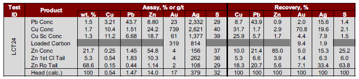 "Locked cycle testing on the Bulk flowsheet option generated recoveries to separate concentrates of 58% Cu, 44% Pb and 85% Zn. Precious metal recovery to Cu and Pb concentrates was demonstrated to be 86.6% Au and 45% Ag."