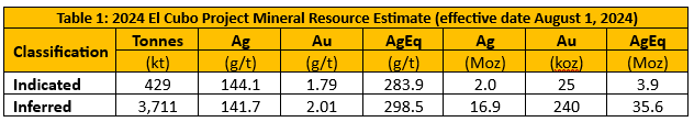 The 2024 MRE comprises Indicated Mineral Resources of 3.9 million troy ounces (Moz) AgEq9 at 283.9 g/t AgEq9 within 429 thousand tonnes (kt), and Inferred Mineral Resources of 35.6 Moz AgEq9 at 298.5 g/t AgEq9 within 3,711 kt. Table 1 presents the complete 2024 El Cubo MRE statement.