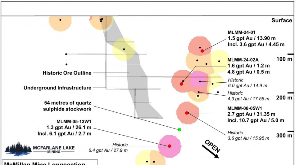 McFarlane intersects a wide zone of mineralized quartz sulphide stockwork at the past producing McMillan Gold Mine, hole MLMM 08-05W1 returning 2.7 gram per tonne (gpt) gold over 31.35 metres including 5.6 gpt gold over 13 metres that contained a higher-grade zone of 10.7 gpt gold over 5 metres.