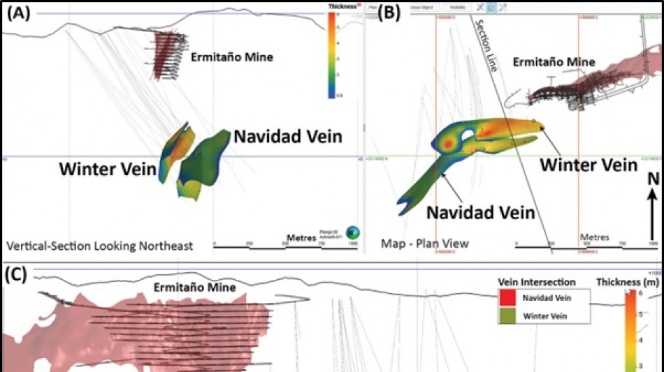 The Navidad and Winter veins are located 100 metres southwest and 350 metres below the Ermitaño Mine complex