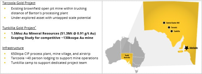 Barton Gold is an ASX, OTCQB and Frankfurt Stock Exchange listed Australian gold developer targeting future gold production of 150,000oz annually, with ~1.6Moz Au JORC Mineral Resources (52.3Mt @ 0.94 g/t Au), multiple advanced exploration projects and brownfield mines, and 100% ownership of the only regional gold mill in the renowned central Gawler Craton of South Australia. *