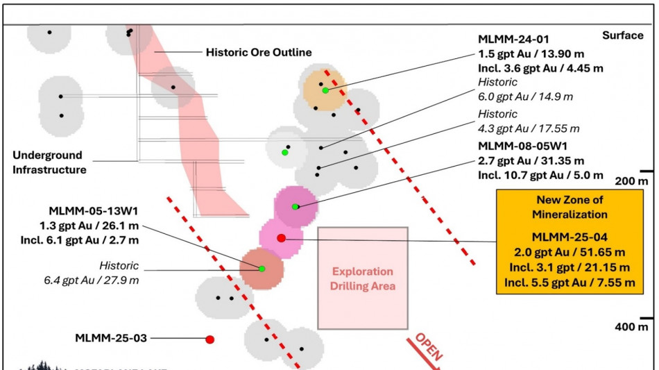 Previously announced drill hole MLMM-08-05W1, see news release February 3, 2025, returned 2.7 gpt gold over 31.35 metres including 5.6 gpt gold over 13 metres that contained a higher-grade zone of 10.7 gpt gold over 5 metres. Hole MLMM-08-05W1 and hole MLMM-25-04, reported in this release, have discovered a wide zone of gold mineralization hosted in quartz sulphide stockwork that is open along strike and at depth.