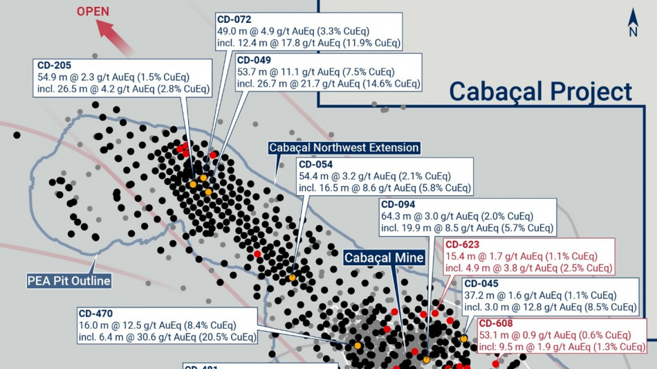 Several holes were drilled into Cabaçal's Southern Copper Zone ("SCZ") down-dip section. CD-606 twinned a hole with lost data, but records indicating that a sample returning >5g/t gold had been encountered. CD-606 intercepted a gold-dominant zone returning 7.3m @ 5.9g/t Au from 78.7m, including a sample returning 0.73m @ 56.7 g/t Au from 80.5m. CD-611, drilled at a slight rotation to strike, returned multiple intersections including 7.0m @ 1.3g/t AuEq (0.9% CuEq) from 112.7m, 23.2m @ 0.8g/t AuEq (0.6% CuEq) from 128.1m, and 14.6m @ 1.5g/t AuEq (1.0% CuEq) from 153.8m. CD-626 drilled through various upper disseminated mineralization layers and a lower layer which included 14.9m @ 0.8g/t AuEq (0.5% CuEq) from 144.7m, 5.6m @ 1.2g/t AuEq (0.8% CuEq) from 161.9m, and 9.6m @ 3.5g/t AuEq (2.4% CuEq) from 182.9m. CD-609 traversed a mining void but returned intersections including 2.1m @ 5.2g/t AuEq (3.5% CuEq) from 47.0m, 14.5m @ 1.3g/t AuEq (0.9% CuEq) from 65.0m.